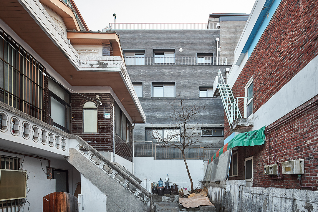 관악구 다세대, 다가구 주택 밀집지역에 있었던 기존의 노후 경로당을 철거하고 새롭게 지역의 작은 중심성을 갖는 모임공간을 신축하였다. 대상지는 건우봉 산자락으로 올라가는 구릉지의 막다른 좁은 골목 끝 대지이다. 지역 어르신들이 주로 사용하는 공간으로서 누구나 접근이 편리한 무장애공간을 마련하고자 했다. 1층에는 지역주민들의 교류, 소통이 가능한 다목적공간을 계획하였다. 2층에는 할머니실, 3층에는 할아버지실로 프로그램 변화에 따라 다양한 경로당 활동이 가능한 융통성 있는 공간을 마련하고자 하였다. 외부공간의 활동과 연계하기 위해 테라스 및 옥상정원을 계획하였으며, 전망 좋은 옥상의 활용도를 높이기 위해 엘리베이터를 옥상까지 올려 쉽게 접근할 수 있도록 했다. 경로당이 단순 쉼터를 넘어 어르신, 그리고 지역민들의 여가문화와 사회참여를 누릴 수 있는 공간이 되길 기대한다.