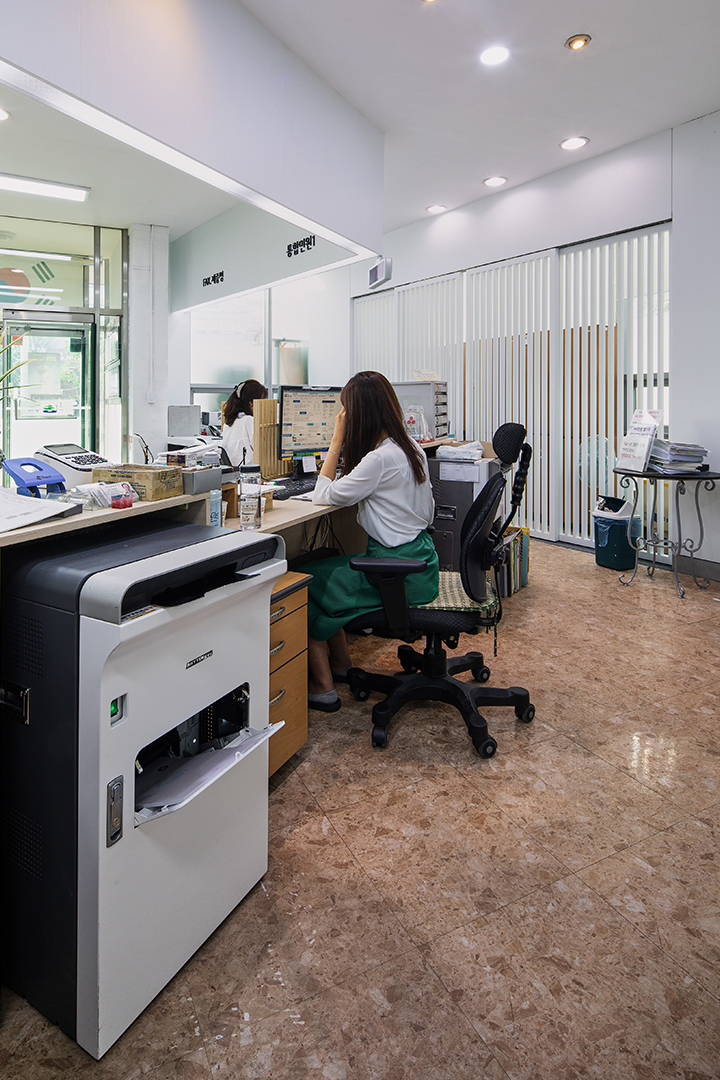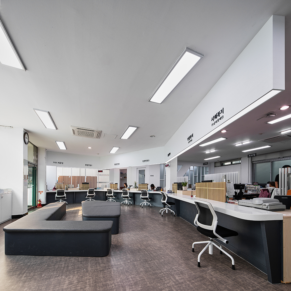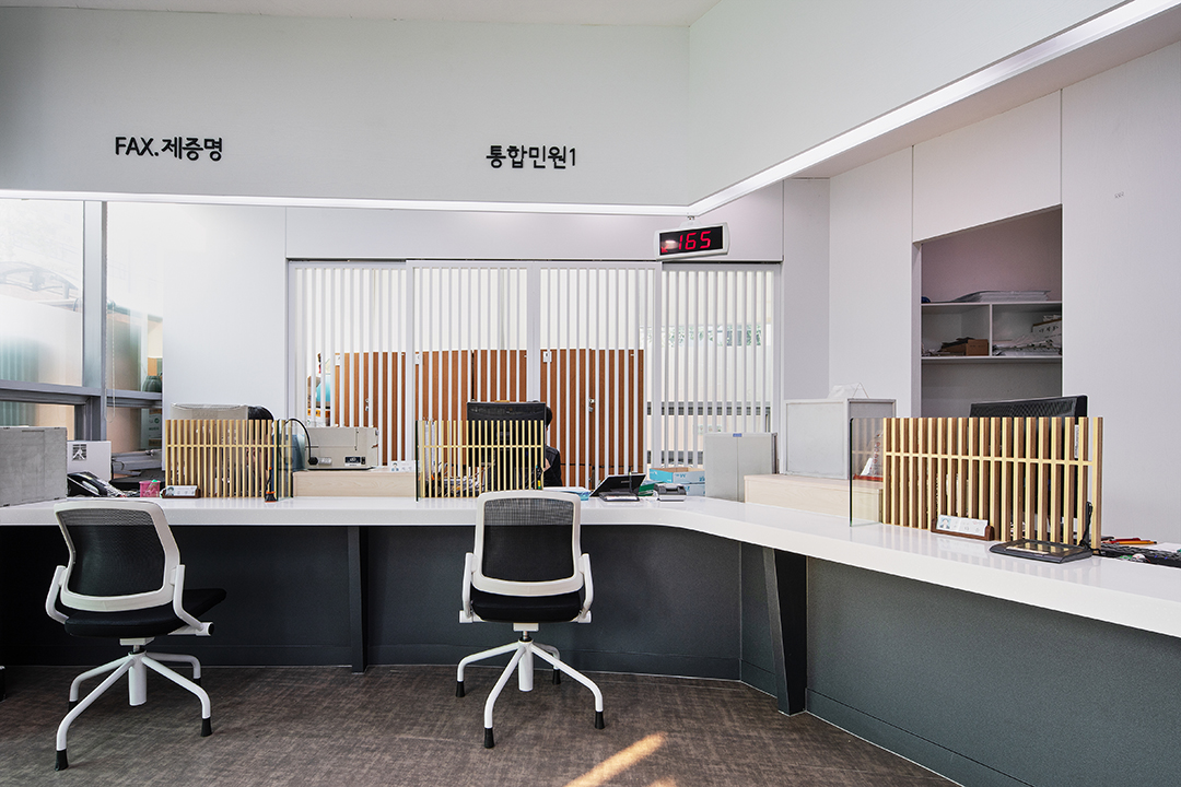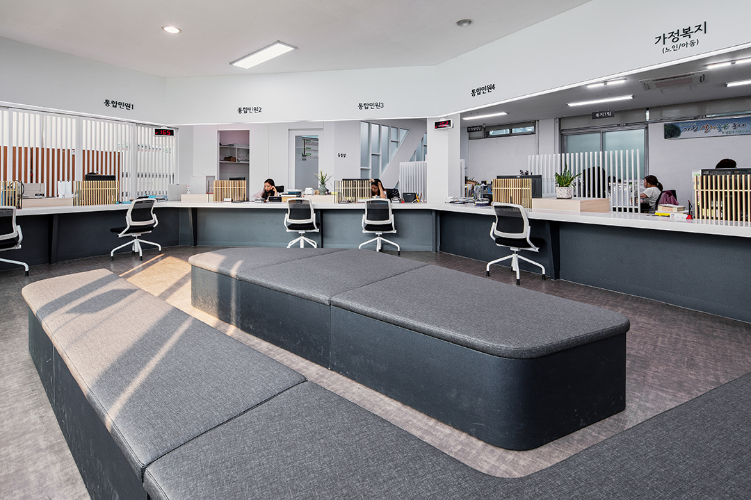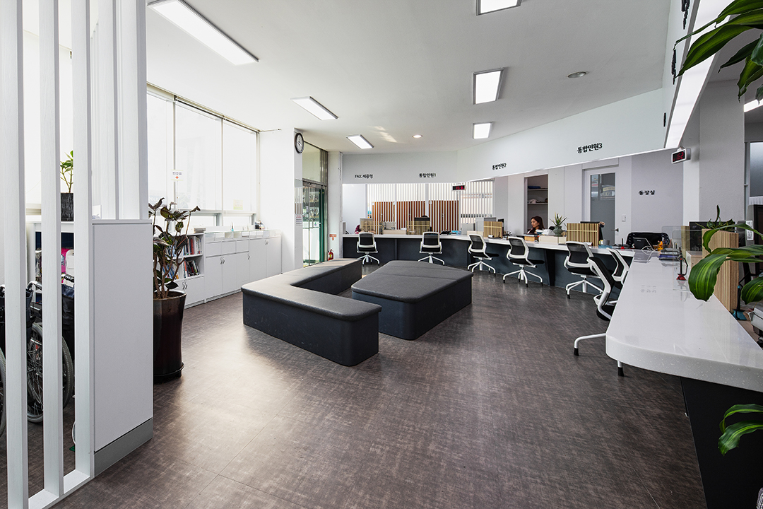 1984년 준공된 문정1동주민센터는 어둡고 노후화되었으며 일반 관공서의 경직된 이미지를 가지고 있었다. 문정법조단지가 인근에 있어서 다른 동주민센터에 비해 민원인 방문이 많은 편임에도 방문객들은 앉아 있을 만한 대기 공간도 없었고, 민원대가 높아 상담하기 힘든 불편한 공간이었다. 이에 방문객을 밝게 맞이하고 주민이 원하는 바에 다방면으로 대응하기 위한 장치를 부여하고자 했다. 민원대는 주민 대기공간을 위요하며 감싸 안는 형태로 재배치하였고, 주민들이 앉아서 마주볼 수 있는 눈높이를 고려하여 계획하였다. 유휴공간을 줄이기 위해 수납공간과 사무용품 보관공간을 빌트인 시스템으로 하고 공간활용도가 높게 가구들을 재배치하며 필요한 복지상담실과 나눔실을 새롭게 만들었다. 쾌적하고 개방감 있는 분위기를 만들기 위해 가능한 밝은 색으로 마감을 하였고, 벽면을 유리나 루버를 활용하여 시각적으로 넘나들게 하여 열린 동주민센터의 이미지를 만들고자 하였다.