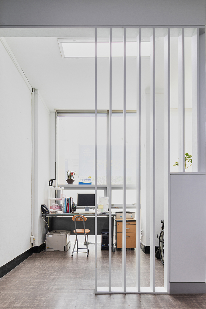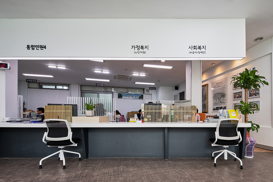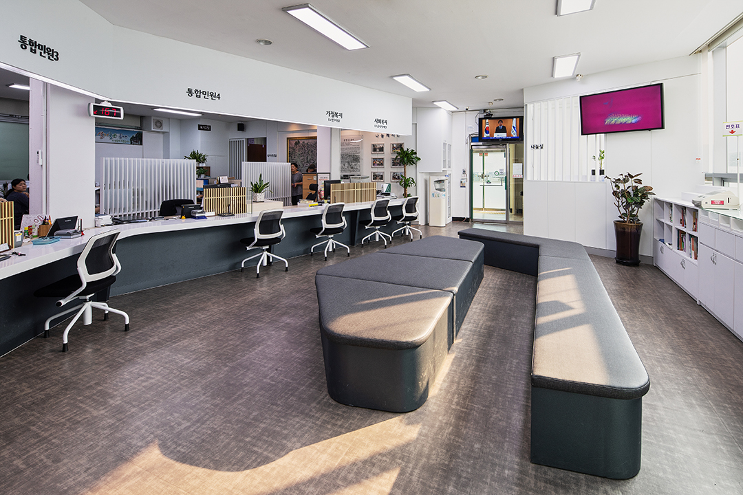 1984년 준공된 문정1동주민센터는 어둡고 노후화되었으며 일반 관공서의 경직된 이미지를 가지고 있었다. 문정법조단지가 인근에 있어서 다른 동주민센터에 비해 민원인 방문이 많은 편임에도 방문객들은 앉아 있을 만한 대기 공간도 없었고, 민원대가 높아 상담하기 힘든 불편한 공간이었다. 이에 방문객을 밝게 맞이하고 주민이 원하는 바에 다방면으로 대응하기 위한 장치를 부여하고자 했다. 민원대는 주민 대기공간을 위요하며 감싸 안는 형태로 재배치하였고, 주민들이 앉아서 마주볼 수 있는 눈높이를 고려하여 계획하였다. 유휴공간을 줄이기 위해 수납공간과 사무용품 보관공간을 빌트인 시스템으로 하고 공간활용도가 높게 가구들을 재배치하며 필요한 복지상담실과 나눔실을 새롭게 만들었다. 쾌적하고 개방감 있는 분위기를 만들기 위해 가능한 밝은 색으로 마감을 하였고, 벽면을 유리나 루버를 활용하여 시각적으로 넘나들게 하여 열린 동주민센터의 이미지를 만들고자 하였다.
