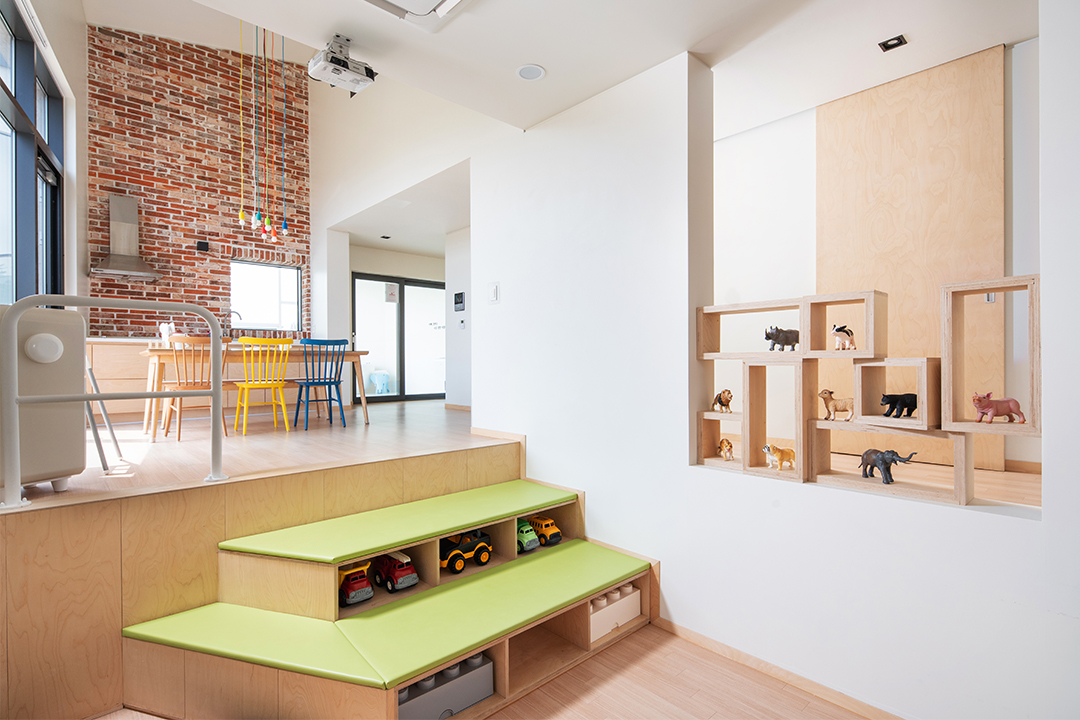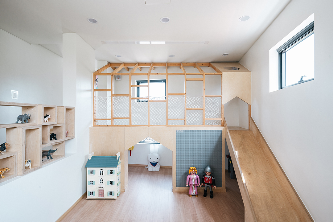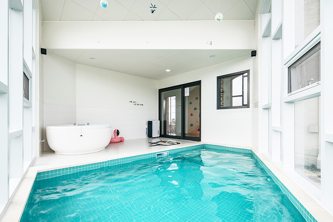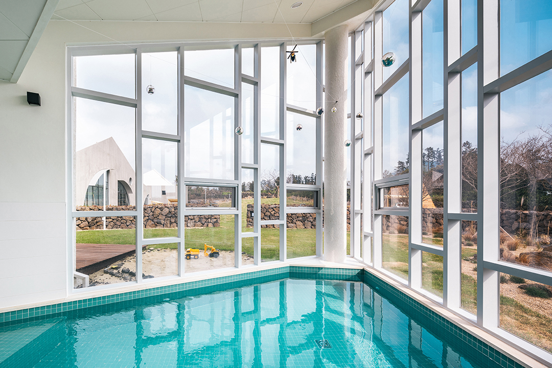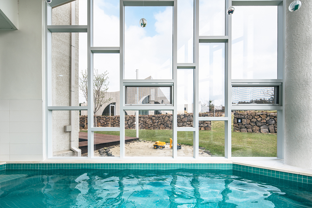 수영장은 햇빛 가득한 숲속 호숫가에서 수영하는 것처럼 느끼게 해주고자 층고 높은 외벽 커튼월 프레임을 자연스럽게 자라난 나뭇가지처럼 표현하였다. 놀이공간에는 그물놀이, 미끄럼틀, 클라이밍, 아지트 공간 등을 입체적이면서도 순환하며 마음껏 뛰어놀 수 있도록 구성하였다. 2층에는 편안히 쉴 수 있는 두 개의 방이 있고, 옥상테라스에 나가면 원거리의 바다와 마을 농경지를 볼 수 있는 휴식공간이 제공된다. 특히 아이들의 안전 확인이 가능하도록 외벽만이 아니라 내부 벽체에도 창문을 설치하였고, 내부 마감재료는 건강을 고려하여 친환경 재료 선택에 초점을 두었다. 부모와 아이들은 언제 어느 공간에서나 시선을 마주하며 즐거운 시간을 함께할 수 있을 것이다.