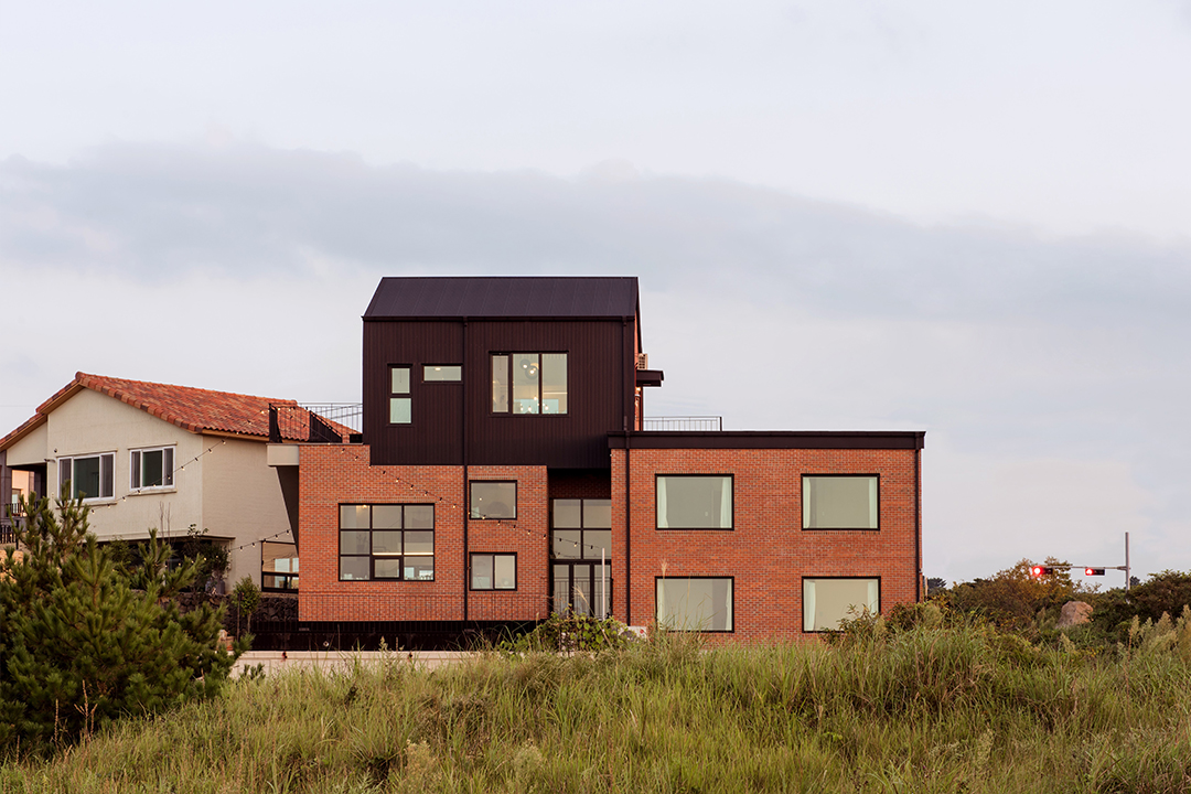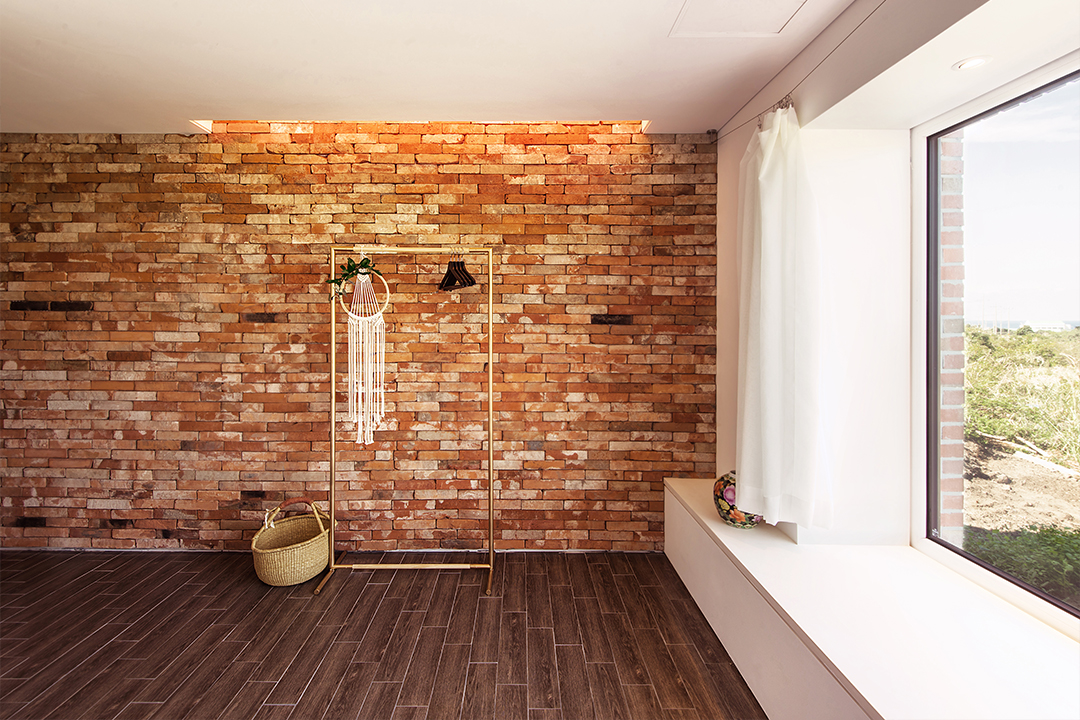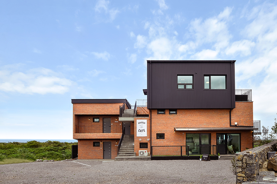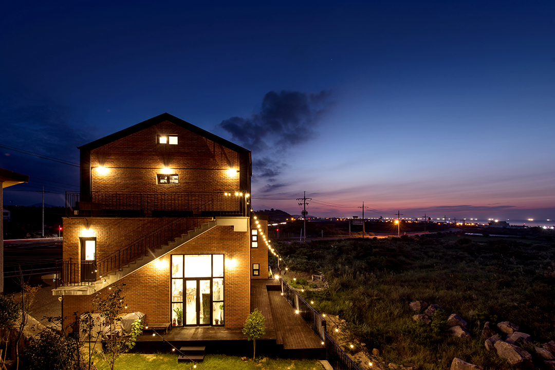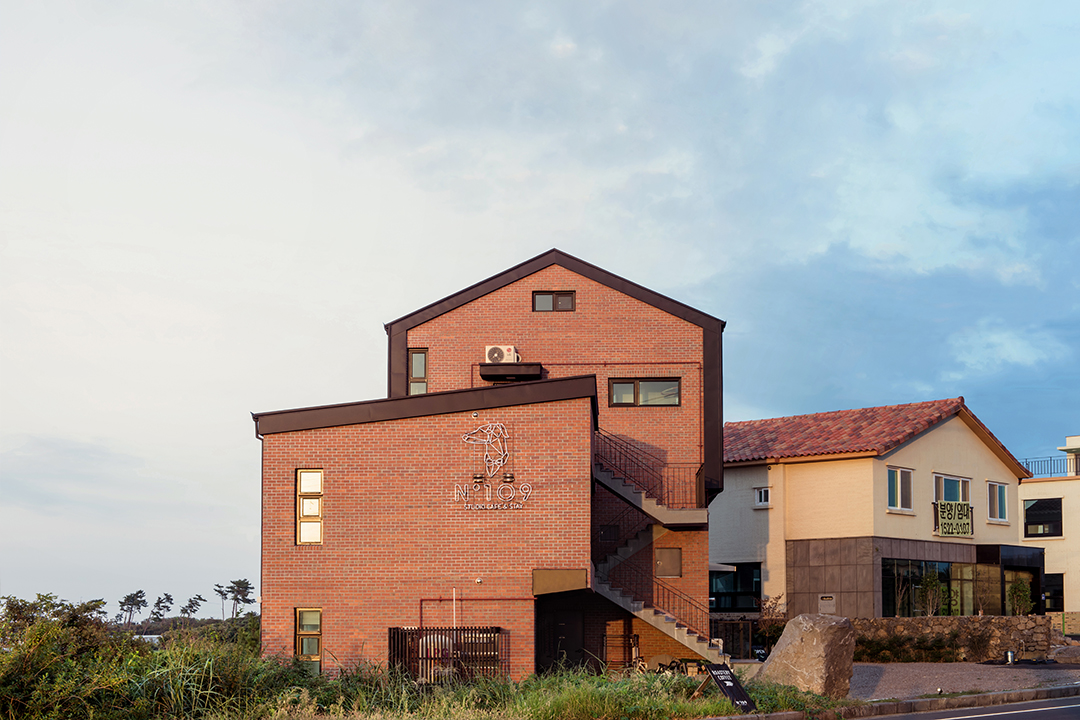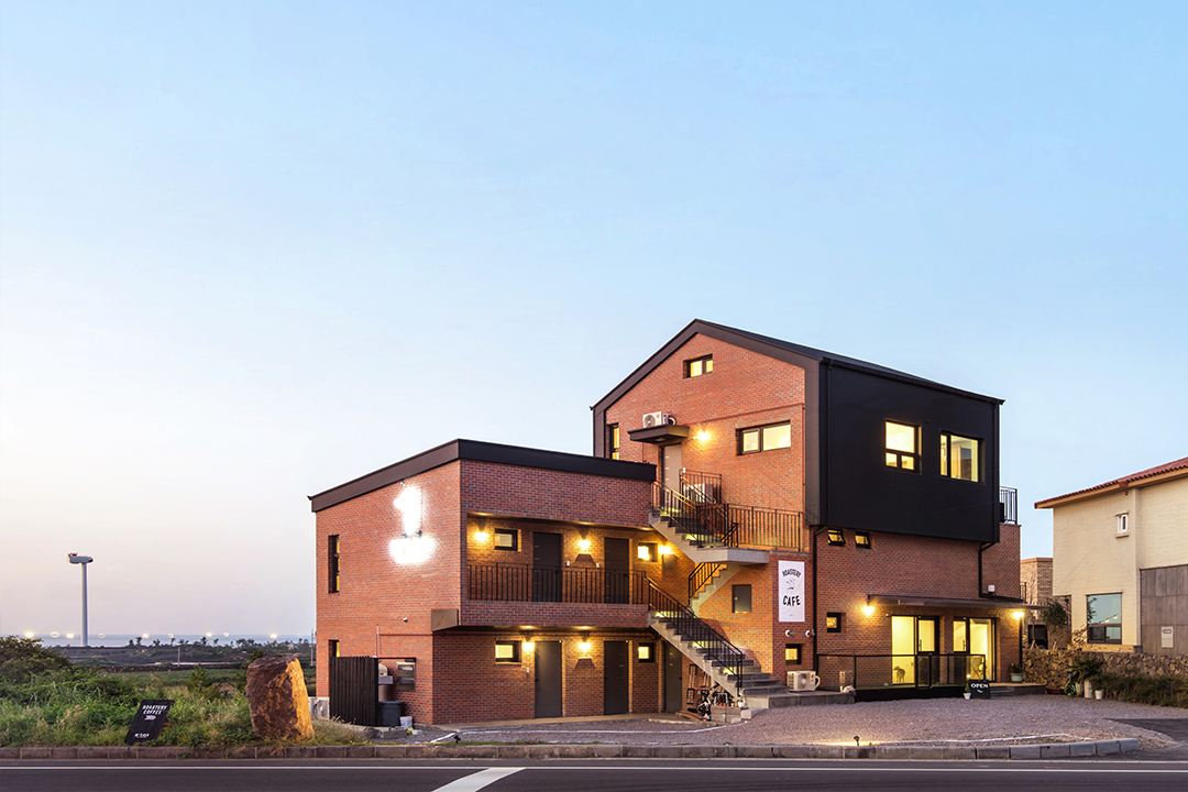 각 공간들은 감성적이면서도 편히 휴식할 수 있는 공간, 사진 촬영을 해도 잘 나올 수 있는 다양한 포토존을 연출하고자 하였다. 특히 확 트인 제주 시골의 풍경을 담아내는 액자와 같은 창 앞의 코지공간은 가장 좋은 촬영공간이다. 건축주가 거주하는 3층 주택은 아래층 붉은벽돌의 상업공간과는 구분하여 색상과 재료, 디자인을 적용하였다. 주택은 외부계단과 입체적 마당과 같은 테라스를 통해 들어가게 되고, 이 테라스에서는 김녕리 자연과 마을 원경을 지붕 위에 걸터앉아 바라보는 듯한 독특한 느낌을 만들고자 했다. 꼼꼼하고 배려 깊은 디자이너 건축주가 직접 맞이하는 곳으로, 풍경 좋은 시골 벽돌집에서 편안한 시간을 보낼 수 있을 것이다.